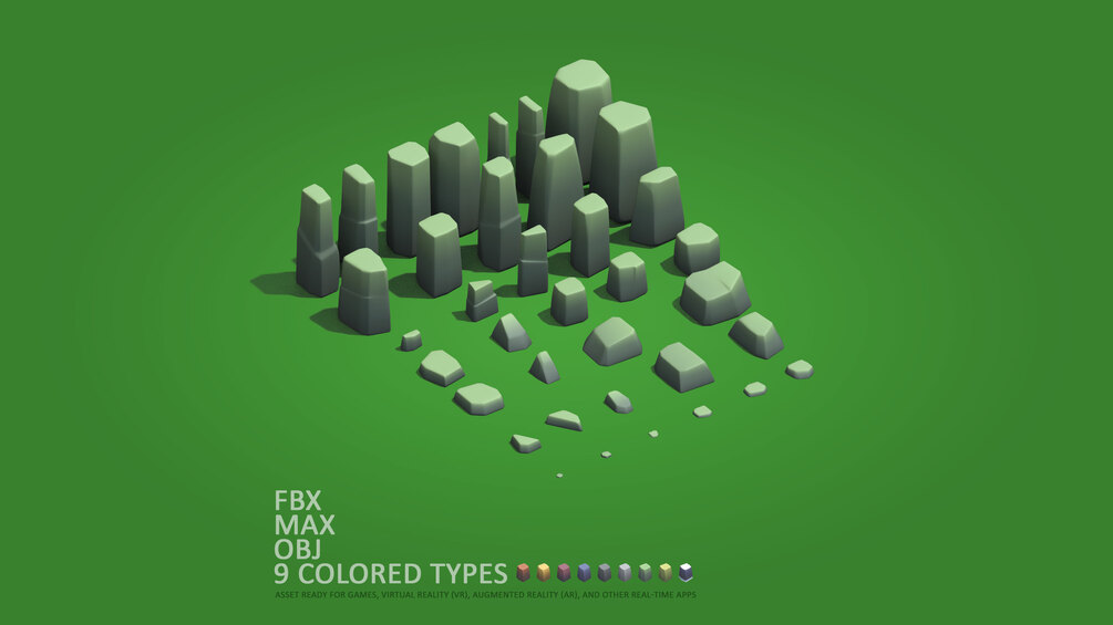 - In Cartoon Stones Pack1 have 3 different modeled variants of stones, each different variant have by 9 coloured types, they all use the one texture.