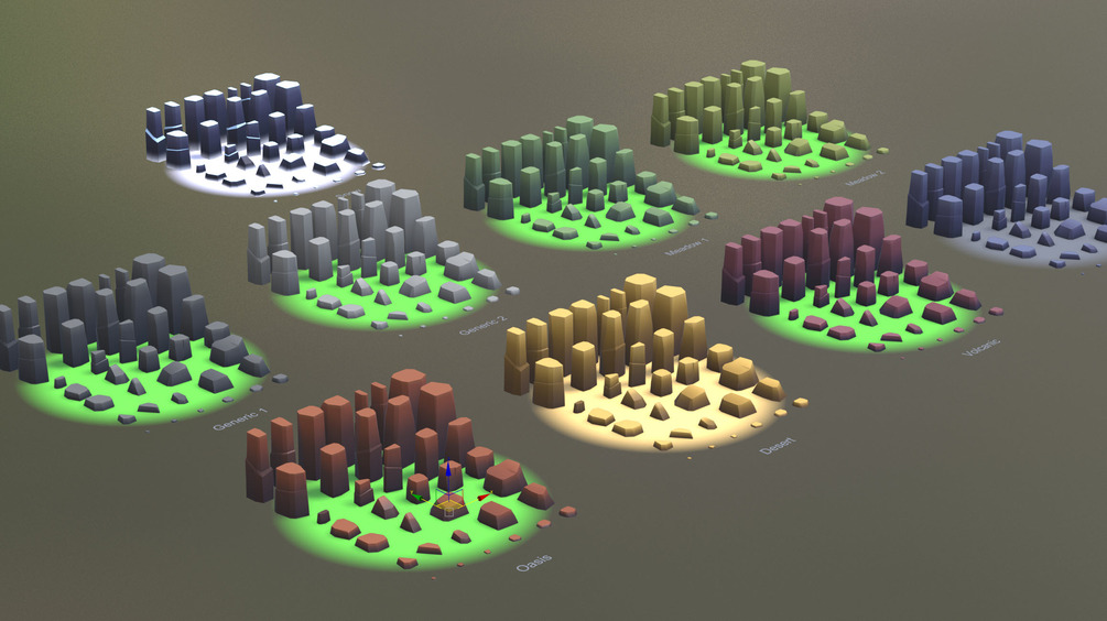 • The colored types are: Desert, Dungeon, Generic-1, Generic-2, Meadow-1, Meadow-2, Oasis, Snow, Volcanic